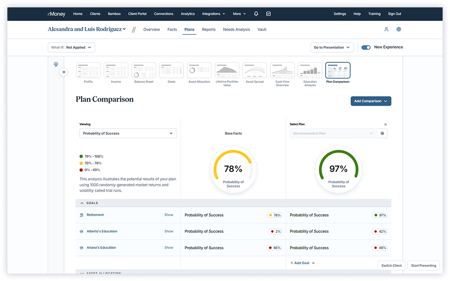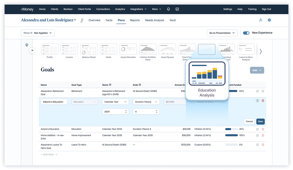 When it’s time to go beyond a single goal, Foundational Planning empowers you to build holistic, goals-based plans in minutes. Streamlined workflows and side-by-side comparisons help you personalize strategies, explore alternatives, and deliver clear recommendations that build client confidence.