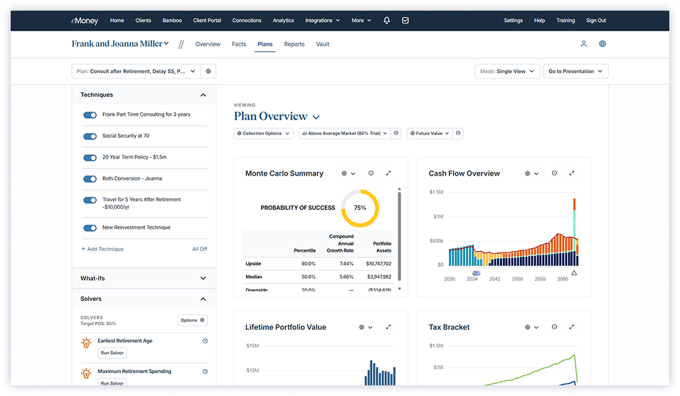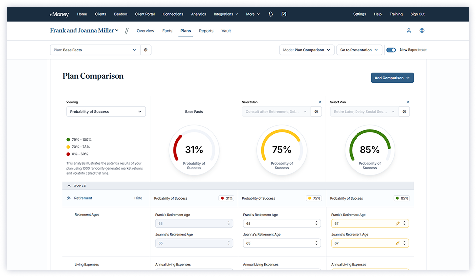 Work with clients to review trade-offs, test different strategies, and align on the final plan that best fits each client’s goals, all within one collaborative experience.